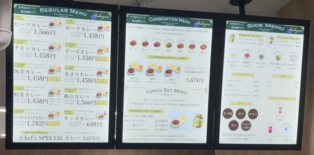 A:お子様、甘口、中辛口、辛口、大辛の中から選べます(大辛は追加料金+108円)。辛さが心配な方はひとつ甘口で頼み、様子を見てみるのも手です。