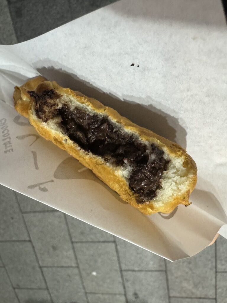 濃厚なチョコクリームの中にクリスピー(ザクザクした食感のビスケット片)が入っており、滑らかなチョコと歯ごたえが混ざり合って非常に満足度が高い一品。